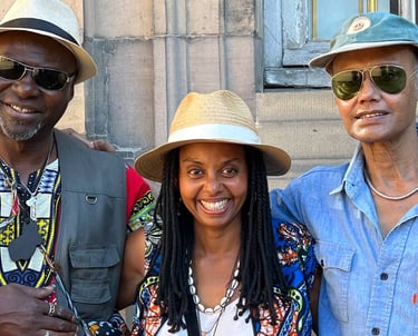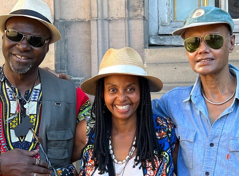 En scène avec le Neferti Chandra orchestra, au festival l'été à Strasbourg, août 2022. Chant et harpe Ngombi aux côtés d'Emilio Bissaya (choeur et guitare) et Shyamal Maitra (percussions).